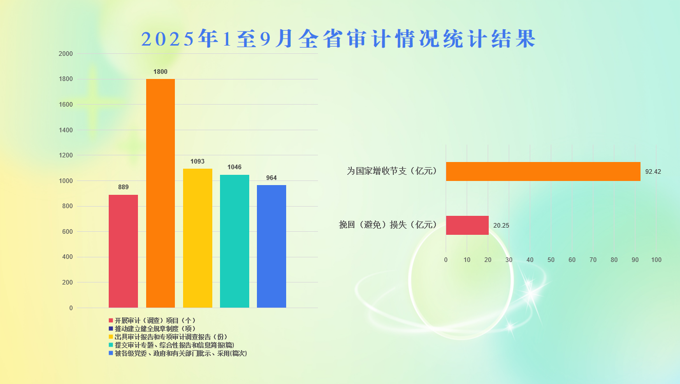 2025年1至9月,全省审计机关共开展审计(调查)项目889个,通过审计为国家增收节支92.42亿元,审计后挽回(避免)损失20.25亿元,推动建立健全规章制度1800项。